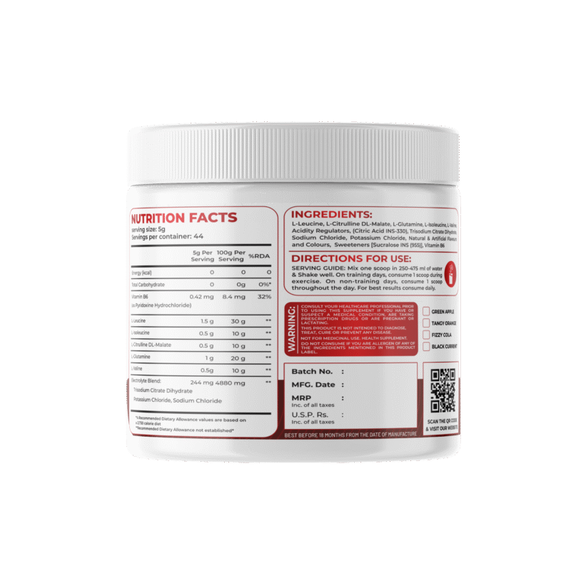 Enriched with Glutamine, Citrulline Malate, and Electrolytes, it helps maintain hydration and performance during intense training.