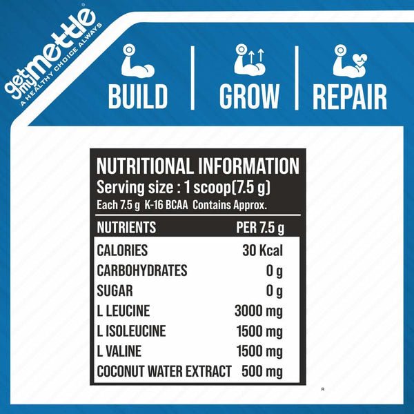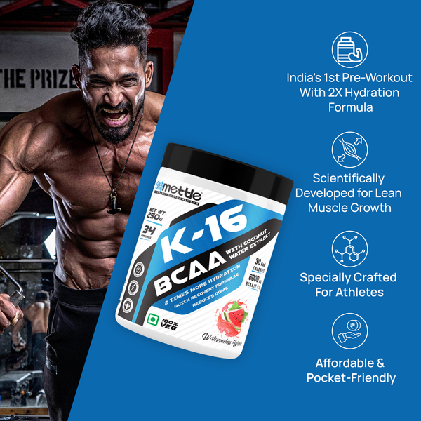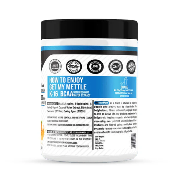 Mettle’s K-16 BCAA is now with coconut water extract. Coconut water for good potassium levels. BCAA (Branched-chain amino acids) consists of 3 essential amino acids Valine, Leucine, and Isoleucine. Valine – helps build and maintain strong muscles. Leucine – helps promote muscle protein synthesis and improves athletic performance. Iso-leucine – promotes muscle recovery and reduces muscle fatigue. Mettle’s K-16 BCAA is India’s best intra-workout supplement for enhanced protein synthesis, speed-up muscle amplification, and recovery. Perfect fit for people who are looking to develop lean muscles. Mettle’s K-16 BCAA helps in reducing stress, fatigue, and weakness, and oxidative damage. A scientifically developed formula, by the industry’s leading experts for the best results. A well-suited product for serious bodybuilders, athletes, sportspersons, and people who want to live a healthy lifestyle. A perfect fit for those health enthusiasts looking for a rich & trustworthy source of essential nutrients. Experience muscular pumps like never before with Mettle’s K-16 BCAA.